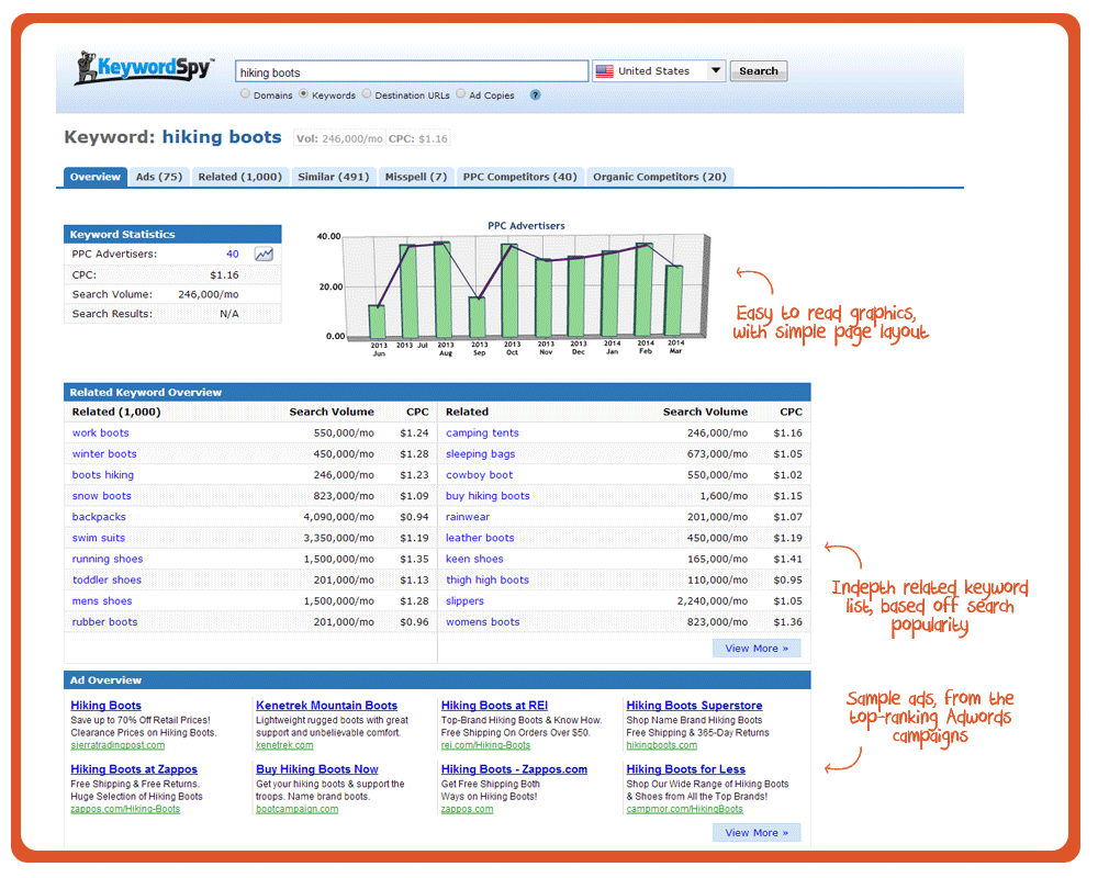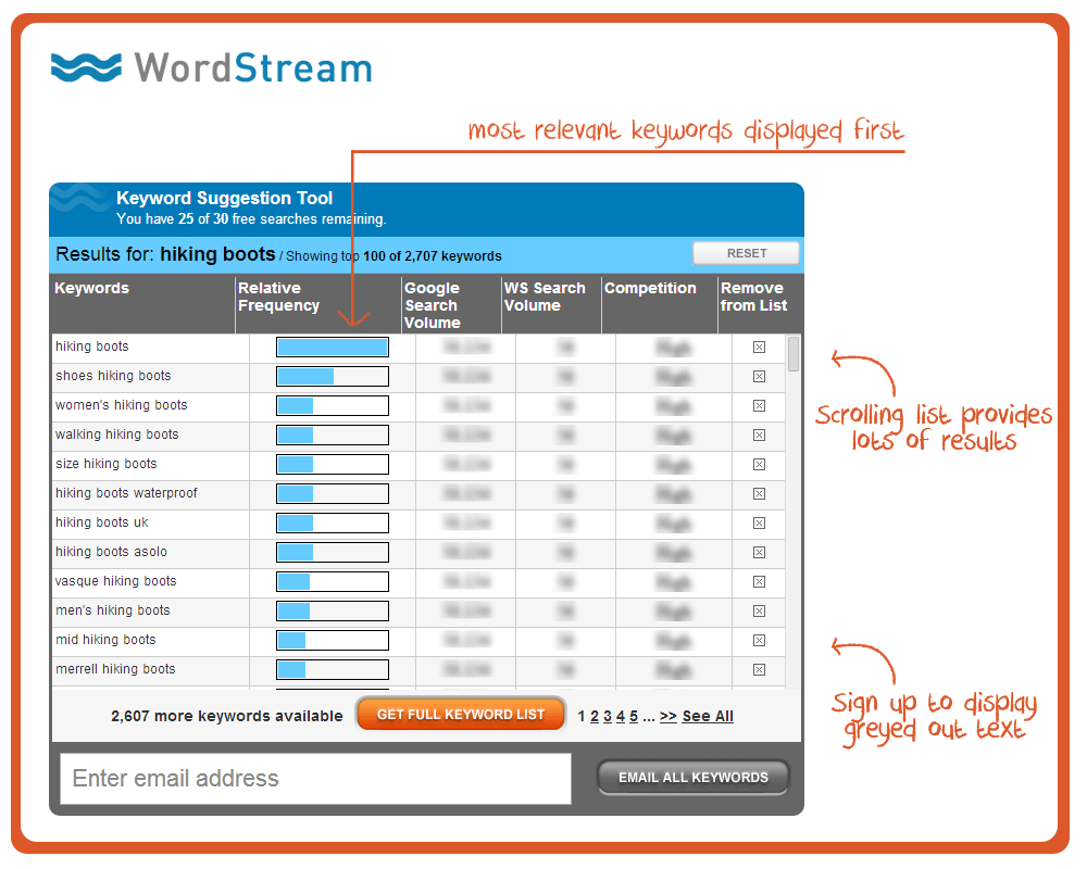 Wordstream is a free keyword tool that allows you to see what keywords are related to the ones you want to target. Using their free keyword tool, simply enter in a keyword you want to check, and click "get keyword ideas". For our query, we typed in hiking boots. As you can see from the picture, it gives you a basic idea of what keywords are related to the one you entered. Wordstream is also recommended by Search Engine Journal, a leading authority in SEO and SEM. You can read Search Engine Journal's review of Wordstream here.