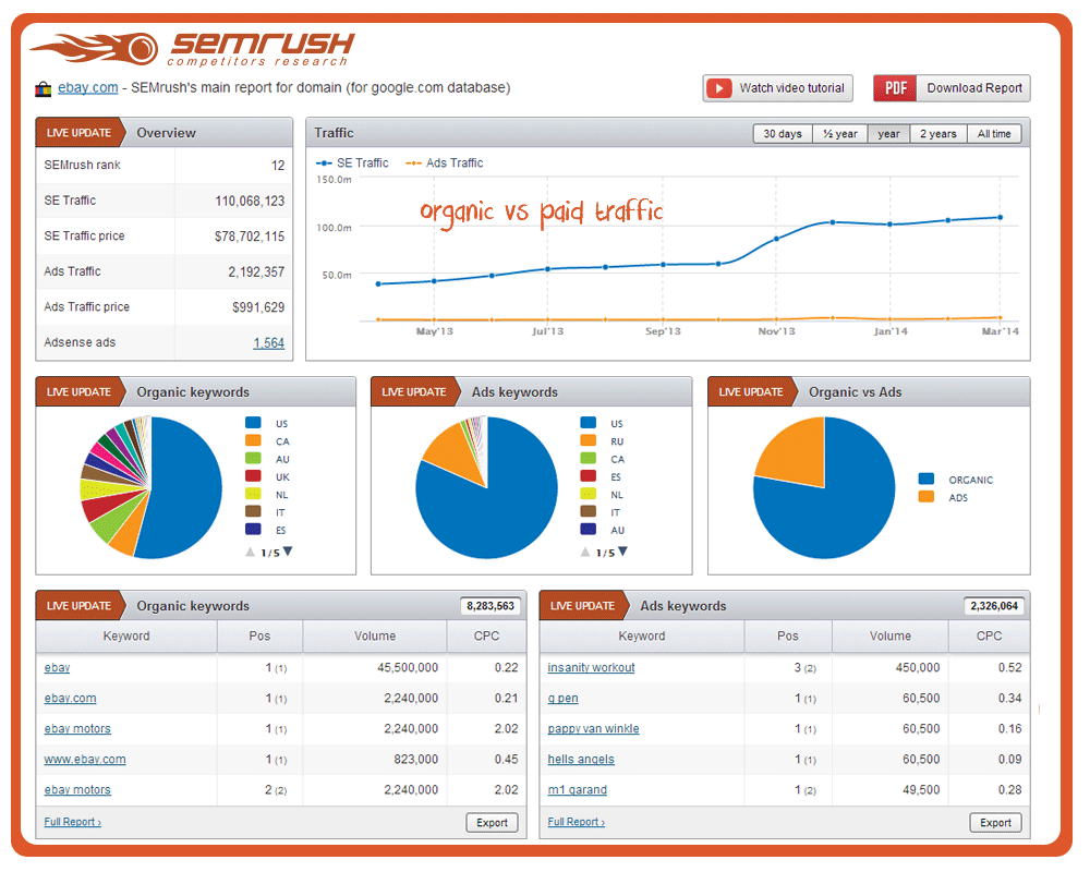 The name of this tool is great, as it literally lets you "spy" on keywords. One of the nicest features about this software is the ease of use. Simply type in any domain you wish to "spy" on. The information you get in return is impressive for a free trial. Some of the info you receive includes data on paid search, who their competitors are, keywords they spend the most money on, amount of clicks per day, and more. The tabbed navigation is nice too, and while you only get 10-20 results in each tab (free version is limited), the information you get is worth it. With the paid version, you can even export your findings into lists of Excel, CSV, or Google Spreadsheets. Sweet!
